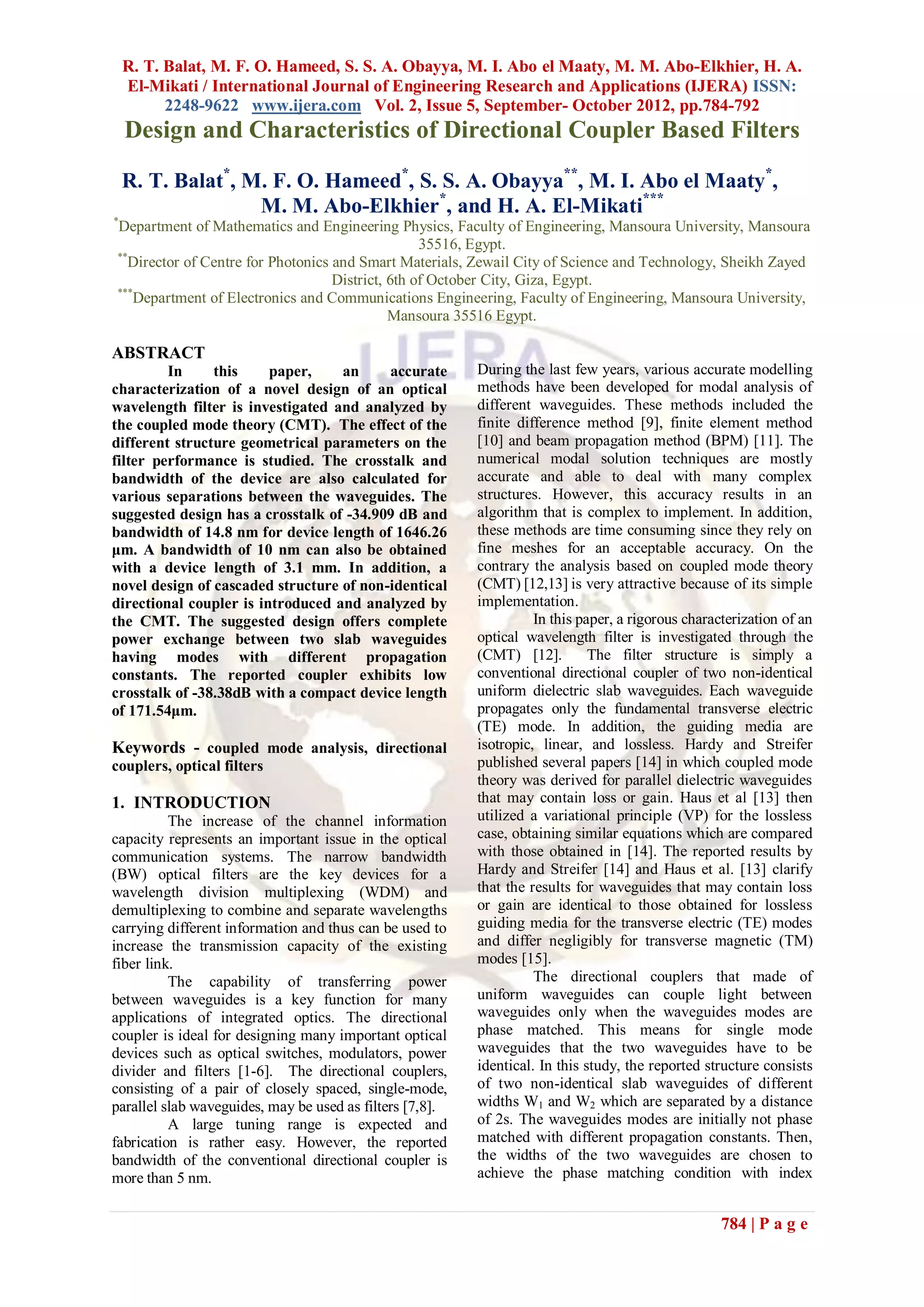 This document summarizes a study investigating the design and characteristics of directional coupler-based optical filters using coupled mode theory. The study examines a directional coupler consisting of two non-identical slab waveguides and analyzes power transfer between the waveguides. It is found that complete power exchange can occur when the waveguide modes are phase matched. The effects of structure parameters on filter response, crosstalk and bandwidth are also analyzed. A novel cascaded coupler structure is introduced to overcome limitations in conventional designs such as decreased coupling efficiency from non-identical waveguides.