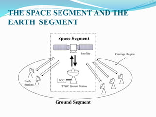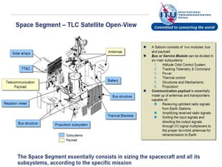 The document discusses the key components and subsystems that make up the space segment of a satellite system. It describes: