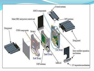 1) The main components of a satellite including the payload (service equipment), bus (vehicle), and subsystems that provide power, attitude control, thermal control, and telemetry/command functions.