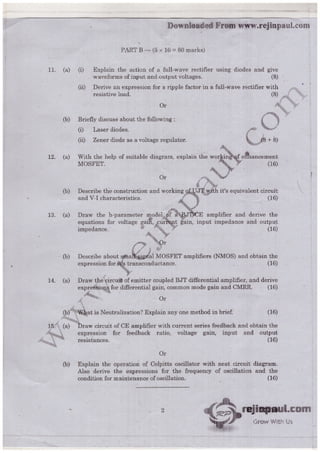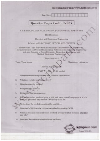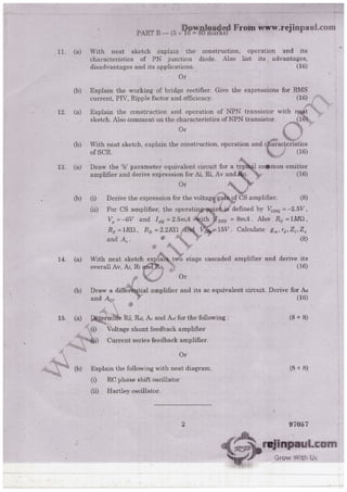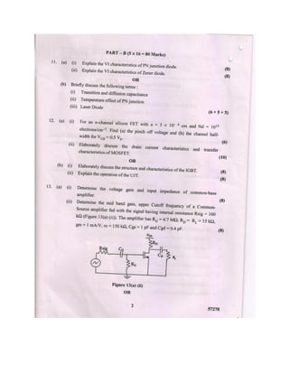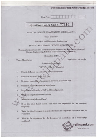 The document outlines a course material for EC6202 on electronic devices and circuits, detailing various electronic components such as diodes, transistors, and amplifiers. It covers their structures, operations, characteristics, and applications, structured into five units focusing on pn junction devices, transistors, amplifiers, multistage amplifiers, and feedback amplifiers. The objectives include familiarizing students with electronic devices' structures and enabling them to design applications using these devices.