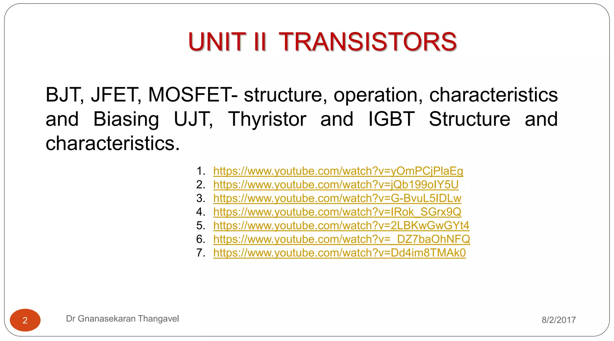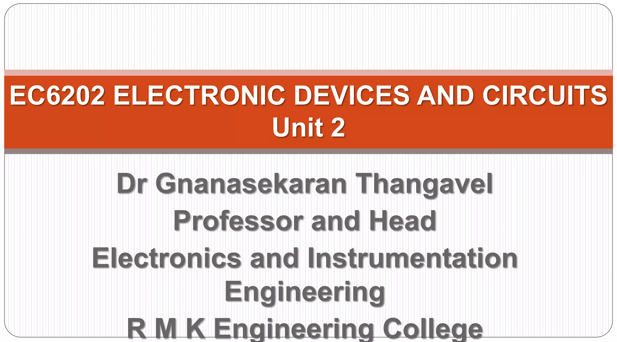 This document covers Unit 2 of a course on electronic devices and circuits, focusing on transistors including BJT, JFET, MOSFET, and others. It discusses their structures, operational characteristics, biasing, and configurations such as common base, common emitter, and common collector, along with practical examples and biasing methods. It aims to provide foundational knowledge on transistor operation in electronic applications.