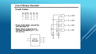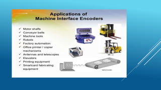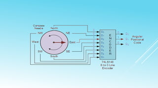 This document summarizes several digital circuit experiments to be conducted in a digital circuits lab session. It includes experiments on code converters, binary addition/subtraction, multiplexers, encoders, decoders, and various counter circuits. Encoders and decoders are explained in more detail. Encoders translate information from multiple inputs into a binary code on fewer outputs, while decoders perform the reverse operation. Both are used for applications involving motion monitoring and control by translating between rotary/linear positions and digital signals. The lab session will provide hands-on experience designing and building these basic digital components and circuits.
