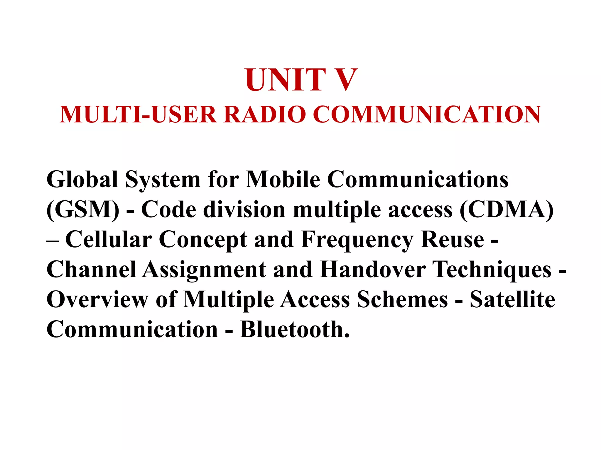 1. The document discusses various multi-user radio communication technologies including the Global System for Mobile Communications (GSM), code division multiple access (CDMA), cellular concepts, frequency reuse, channel assignment, handover techniques, satellite communication, and Bluetooth.