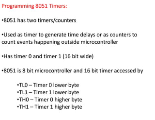 - Programming timers in 8051 microcontrollers for time delays and waveform generation.