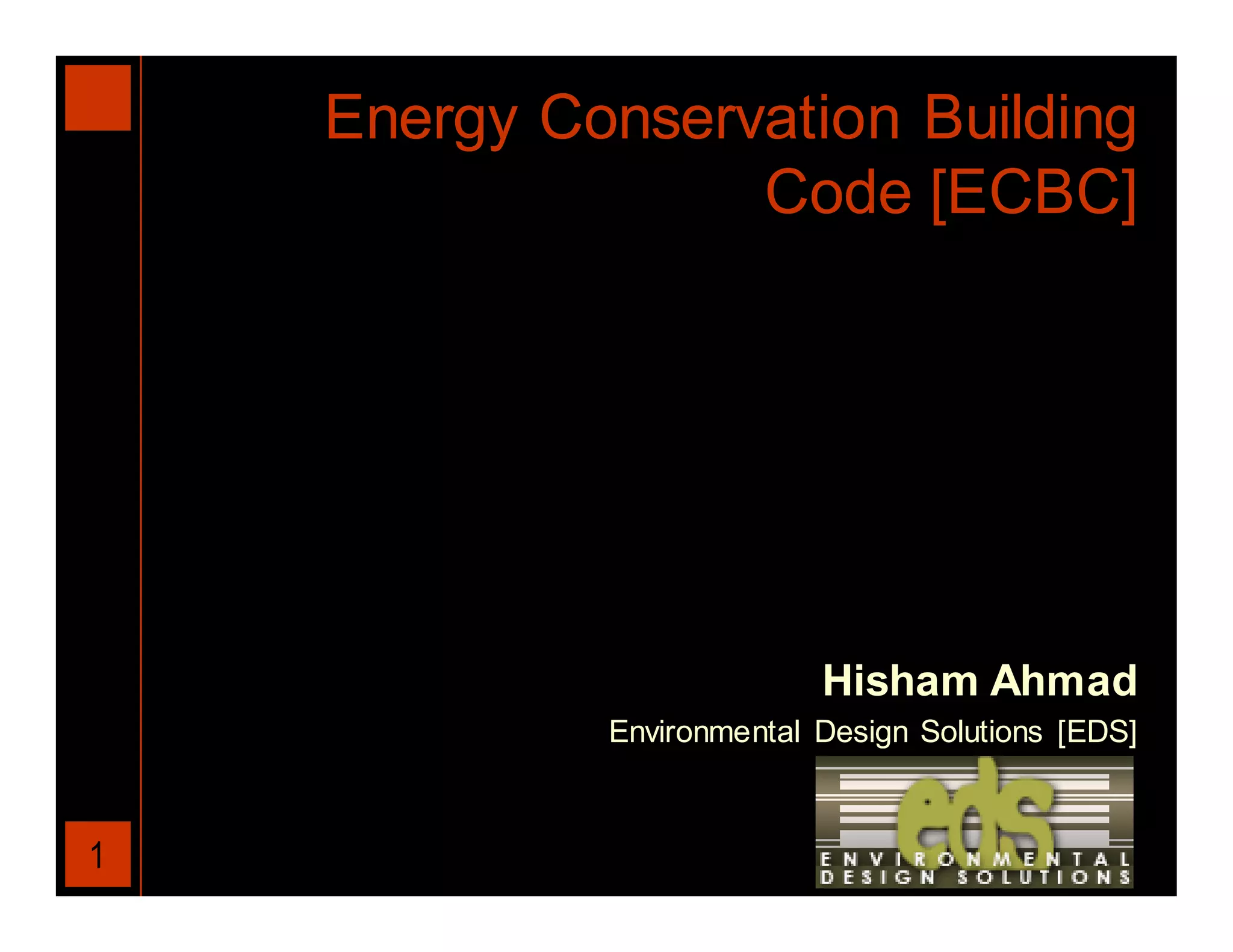 The document discusses India's Energy Conservation Building Code (ECBC). It aims to set minimum energy efficiency standards for building design and construction. The ECBC encourages energy efficient practices that do not compromise occupant comfort or economic considerations. It provides the central and state governments powers to enforce compliance. The ECBC is estimated to reduce building energy use by 25-40% through requirements for the building envelope, lighting, HVAC, and other systems. Widespread adoption could yield annual national energy savings of over 1.7 billion kWh. Implementation faces barriers around first costs, product availability, and testing/certification.