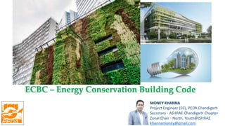 The document provides information about ECBC (Energy Conservation Building Code), which specifies energy performance requirements for commercial buildings in India. It discusses key aspects of ECBC such as its objectives, scope, components, impact in reducing energy consumption, implementation in various states, and case studies of ECBC compliant buildings showing significant energy savings. ECBC aims to minimize energy use and carbon emissions from buildings through passive design strategies and efficient technologies.