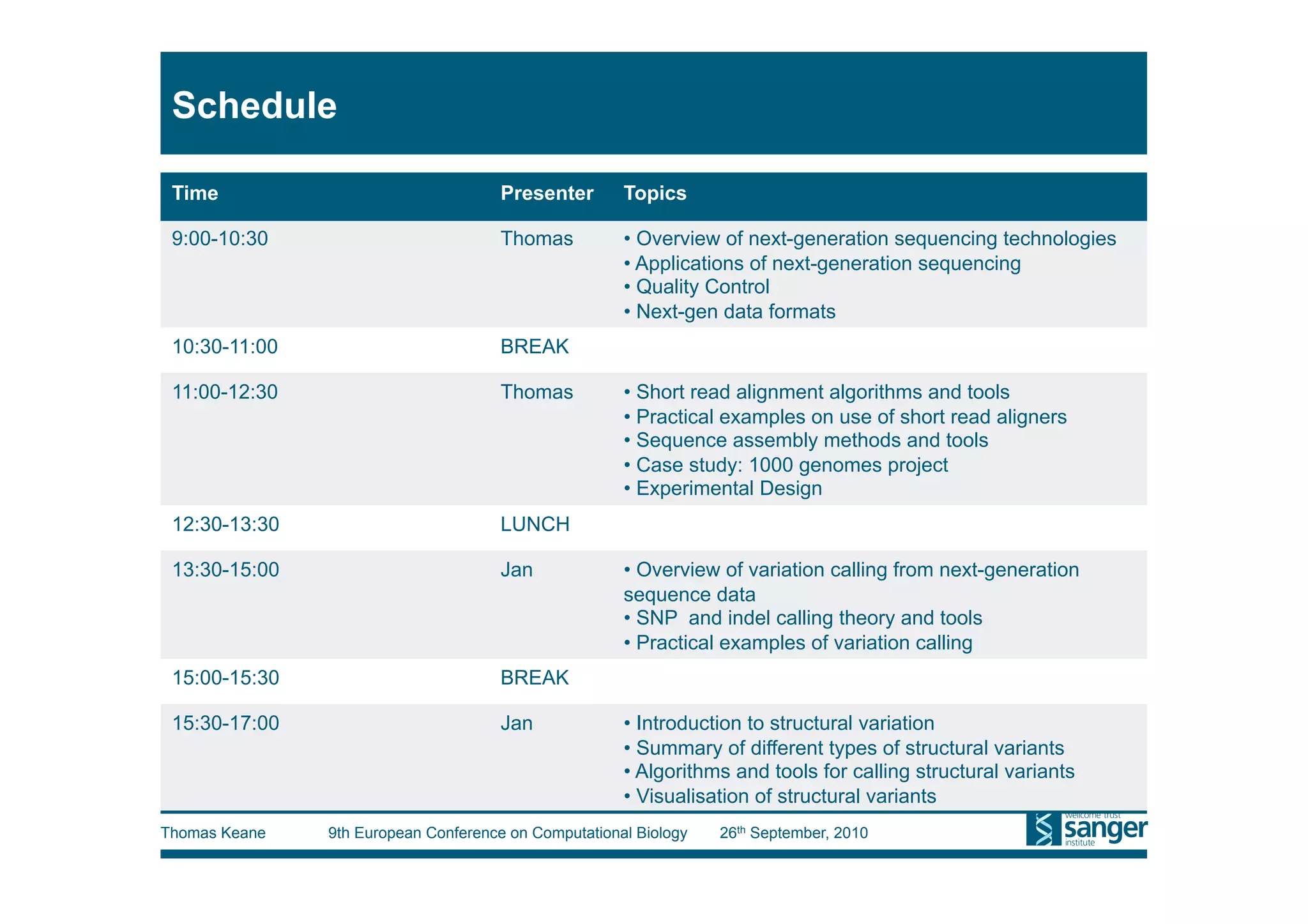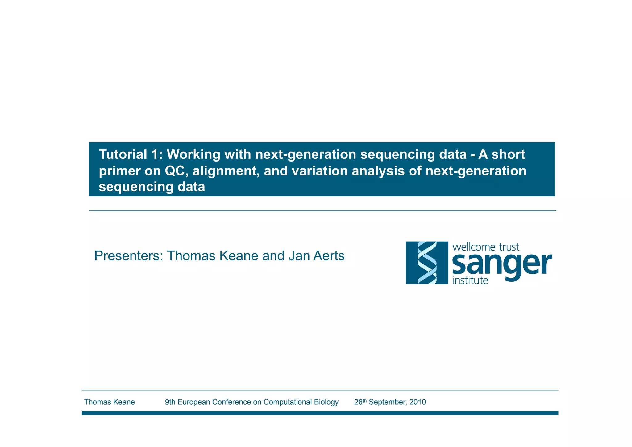 This tutorial provides an overview of working with next-generation sequencing data, including quality control, alignment, and variation analysis. It covers topics such as next-gen sequencing technologies and applications, quality control measures, short read alignment algorithms and tools, sequence assembly methods, and calling variants from sequencing data. The tutorial is presented by Thomas Keane and Jan Aerts at the 9th European Conference on Computational Biology.