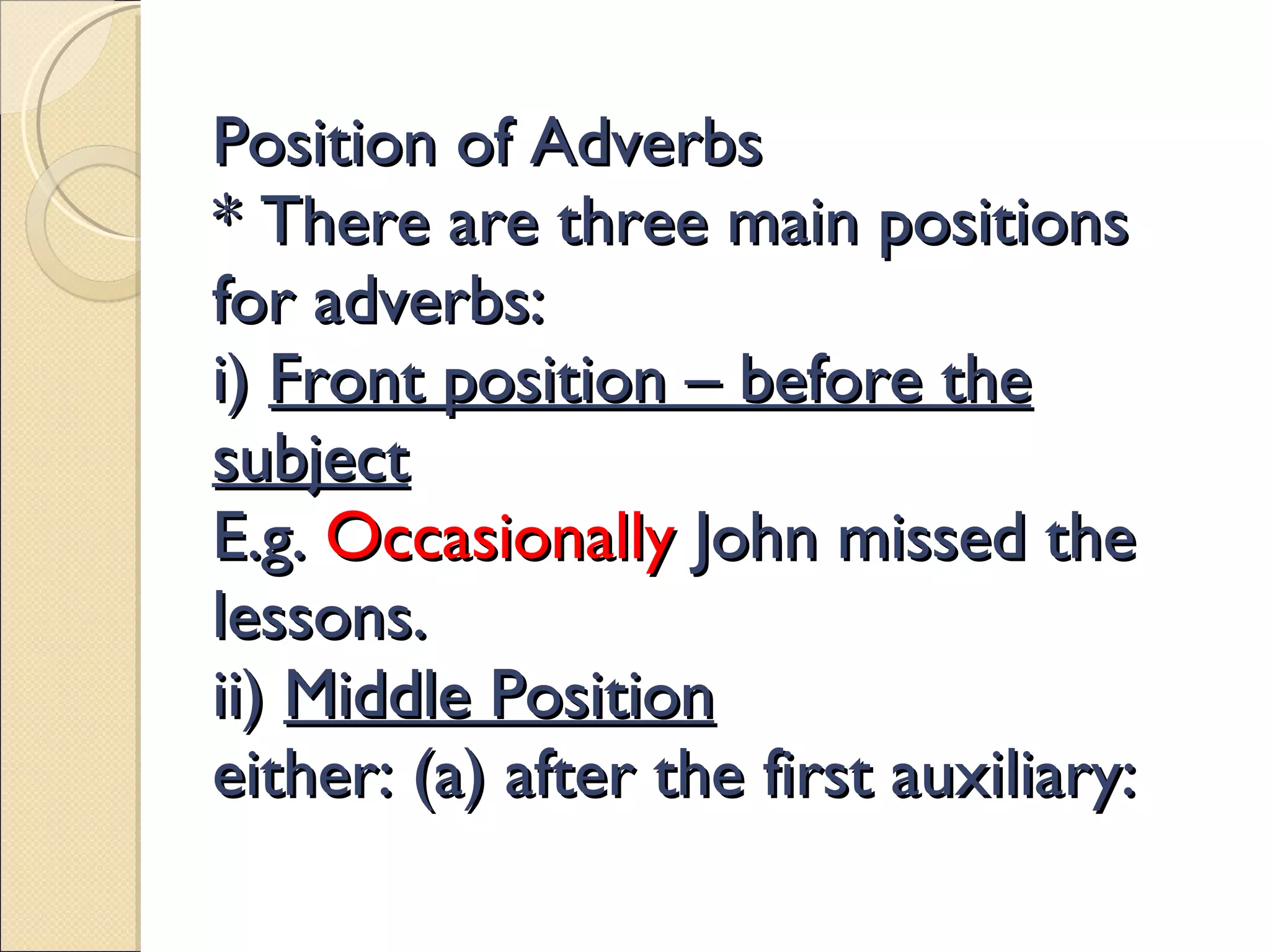 This document discusses the positions of adverbs in sentences. There are three main positions for adverbs: front position before the subject, middle position after an auxiliary verb or the verb "to be", and end position at the end of the clause. Different types of adverbs typically occur in different positions, such as manner adverbs at the end and linking adverbs at the front of sentences. The document provides examples of different adverb types and their typical positions.