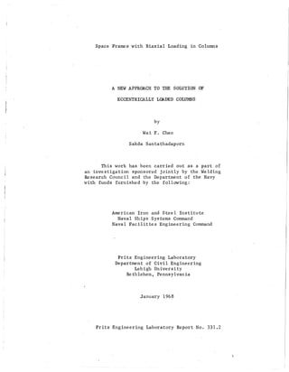 The document presents a new approach to analyzing eccentrically loaded columns made of perfectly plastic material. Rather than solving for the deflection curve, the approach solves for the curvature curve. This simplifies the analysis. Expressions are derived for the curvature curve of a column with rectangular cross-section at different stages of plasticity, including elastic behavior, yield on one side, and yield on both sides. The curvature curve solutions allow directly calculating critical loads. Analytical results are found to agree well with existing solutions.