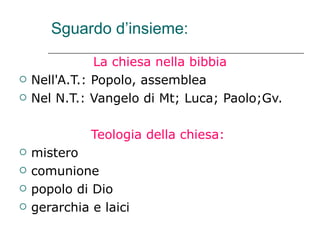 Il documento esplora le diverse dimensioni e funzioni della Chiesa, presentandola come il Corpo di Cristo, tempio dello Spirito Santo e sposa dell'Agnello. Analizza i fondamenti biblici e le strutture ecclesiali, symbolizzando la Chiesa come comunità di fede e missione per la salvezza nel mondo, e sottolinea l'importanza della Comunione e dei carismi. La Chiesa inizia con Gesù, cresce attraverso l'azione dello Spirito e si confronta con le sfide moderne, cercando un rinnovamento post-conciliare in un dialogo aperto con il mondo.