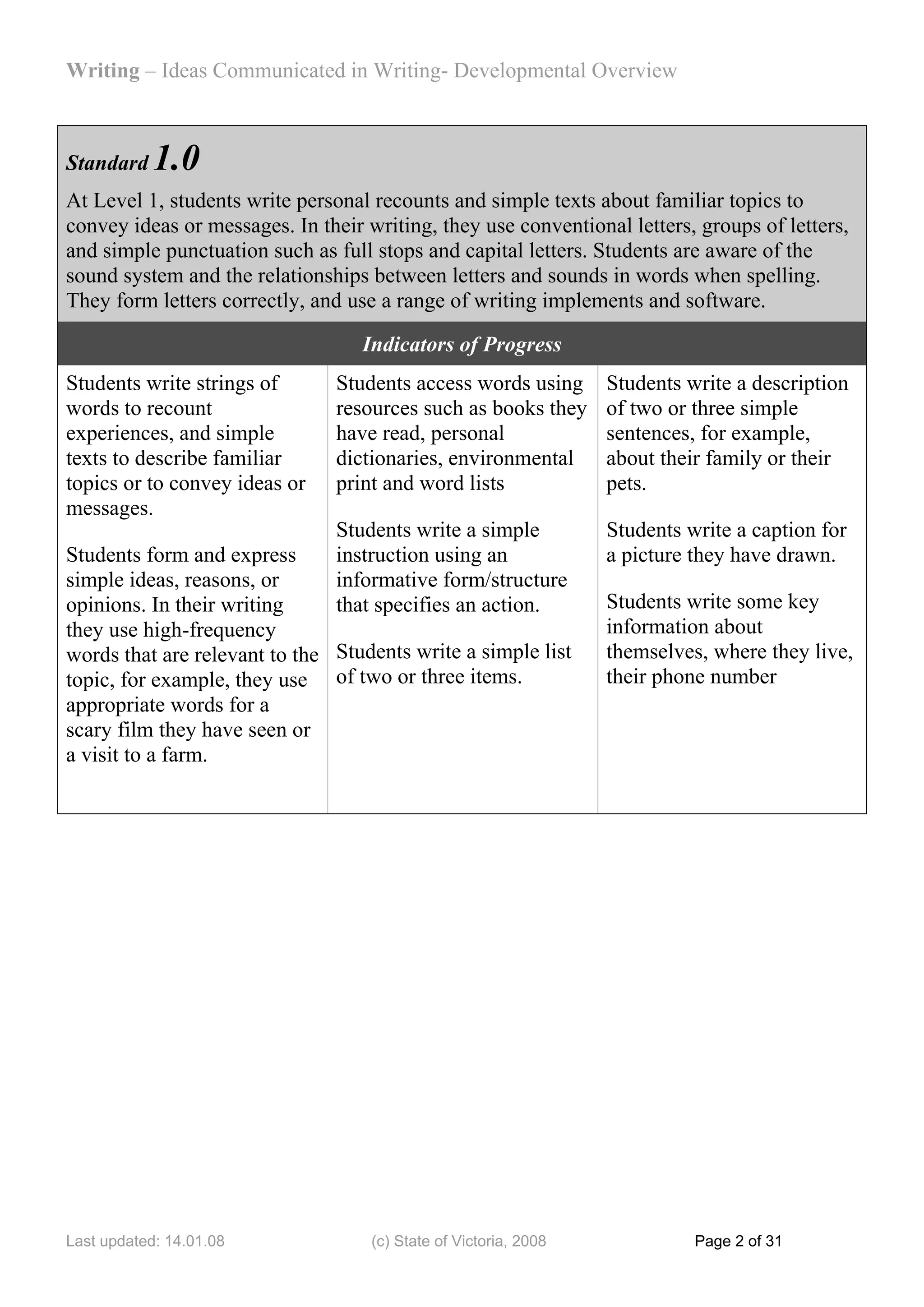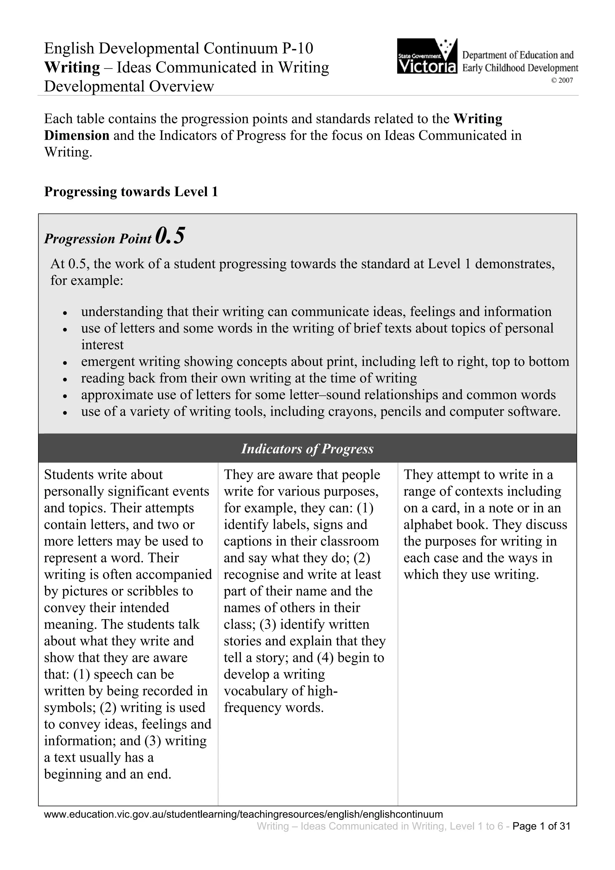 The document provides an overview of the developmental progression of writing skills focused on communicating ideas from pre-level 1 to level 1. It describes how students progress from using letters and words to convey meaning in their writing to writing simple texts about familiar topics using letters, words, and basic punctuation. The indicators of progress show how students begin to sequence ideas and write for different purposes as their skills develop.