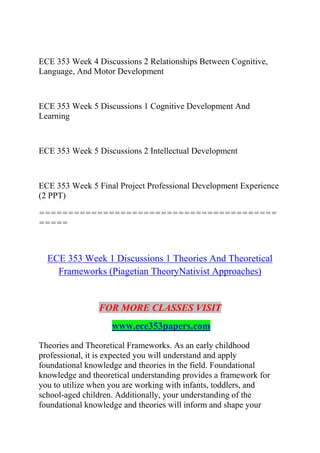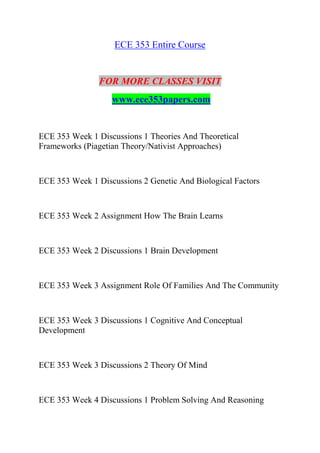 This document provides an overview of the course content for ECE 353, which covers topics related to child development theories, brain development, cognitive development, and applying knowledge to work with children. The course consists of weekly discussions and assignments that require students to analyze theories of cognitive development, factors influencing neurodevelopmental disorders, the relationship between the brain and learning, the impact of environment and trauma on brain development, and developing professional strategies based on this knowledge. Students are expected to apply course concepts and research to further their understanding of child development and inform their approaches to working with children.
