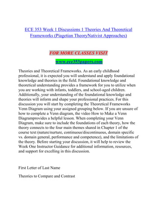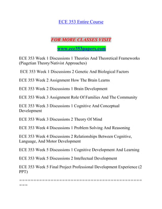 This document provides an overview of the course ECE 353, including weekly discussions and assignments on topics related to child development such as theories of cognitive development, brain development, the impact of environment and trauma, and strategies for supporting children. The discussions and assignments involve comparing developmental theories, examining the influence of genetic and biological factors on disorders, exploring how the brain learns, and considering implications for working with children and families.