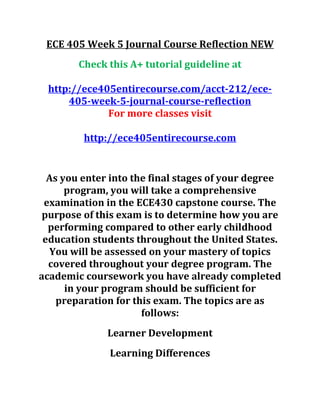 This document discusses an upcoming capstone course and exam for an early childhood education degree program. It lists 11 exam topic areas that will assess students' mastery of topics covered throughout their degree programs. Students are asked to select 5 of the 11 topics and describe how they will demonstrate cultural competence in those areas through commitment statements for their future roles. An example commitment statement is provided for the topic of "Learner Development". Students are then prompted to write a 250-300 word journal entry selecting 5 topics and explaining how they would apply principles of cultural competence in those areas.