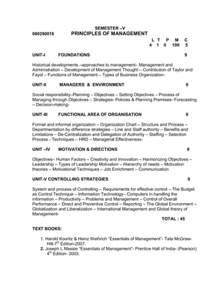 This document provides course information for Principles of Management, a subject taught in the 5th semester of the B.E Electronics and Communication Engineering program at Anna University of Technology, Coimbatore. The course is worth 5 credits and includes 4 hours of lecture and 1 hour of tutorial per week. It covers topics such as the history of management thought, functions of management, social responsibility, planning, motivation, leadership, and controlling strategies. The document provides details on the course content, textbooks, and references.