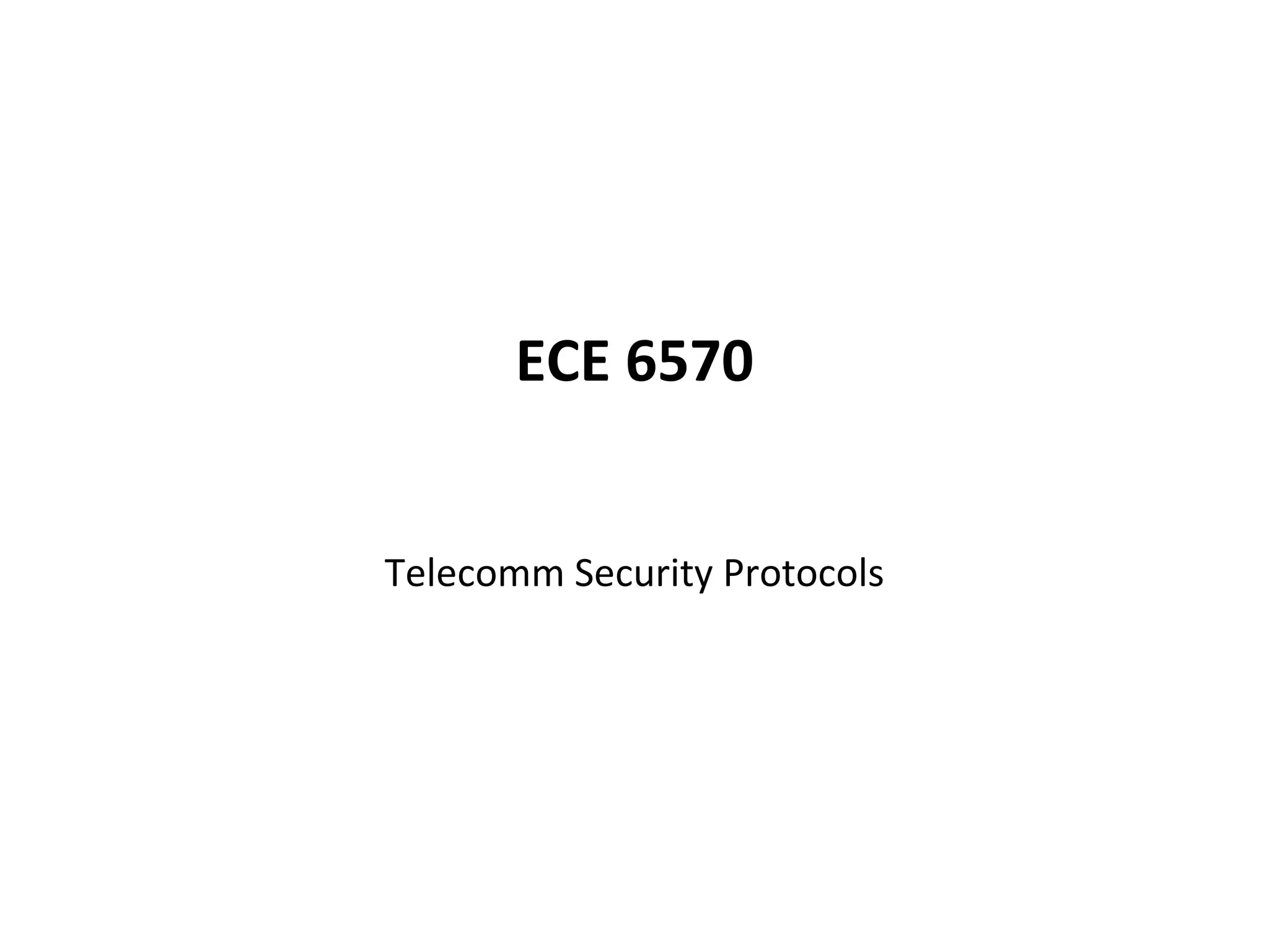 The document discusses the course ECE 6570 Telecomm Security Protocols. It defines telecommunications, protocols, and security. It outlines the schedule and topics to be covered in the course, including telecommunications, protocols, and security over three sections. It also describes the grading breakdown and homework assignments.