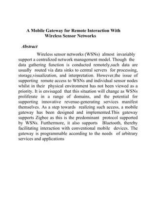 The document discusses the design of a secure wireless monitoring and control system for smart grids and smart homes. The system uses a secure access gateway (SAG) that serves as an interface between remote users and managed devices, allowing real-time secure monitoring and control of devices via smartphones. The SAG aims to address security and capacity challenges through multilayer techniques, including network protocol development, secure physical layer design, and dynamic resource management. The system is intended to facilitate remote monitoring and control of home and office devices from smartphones.