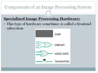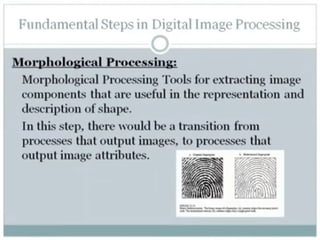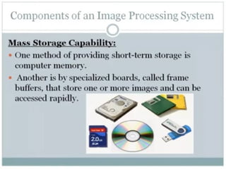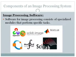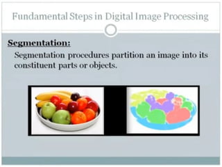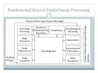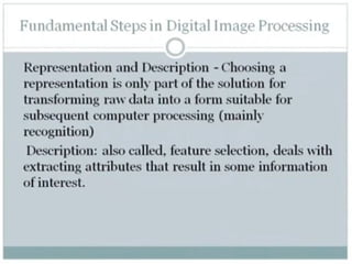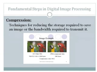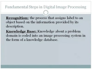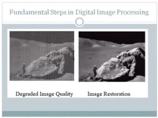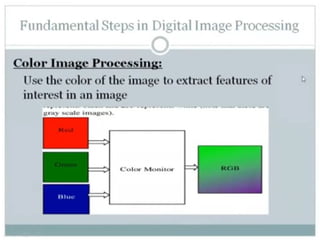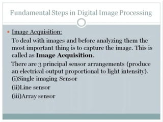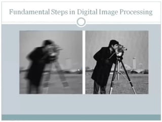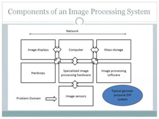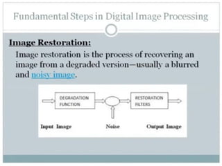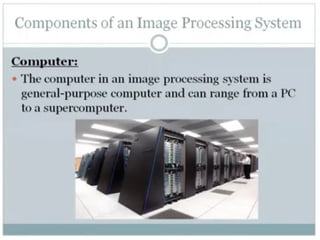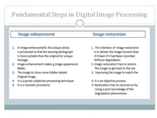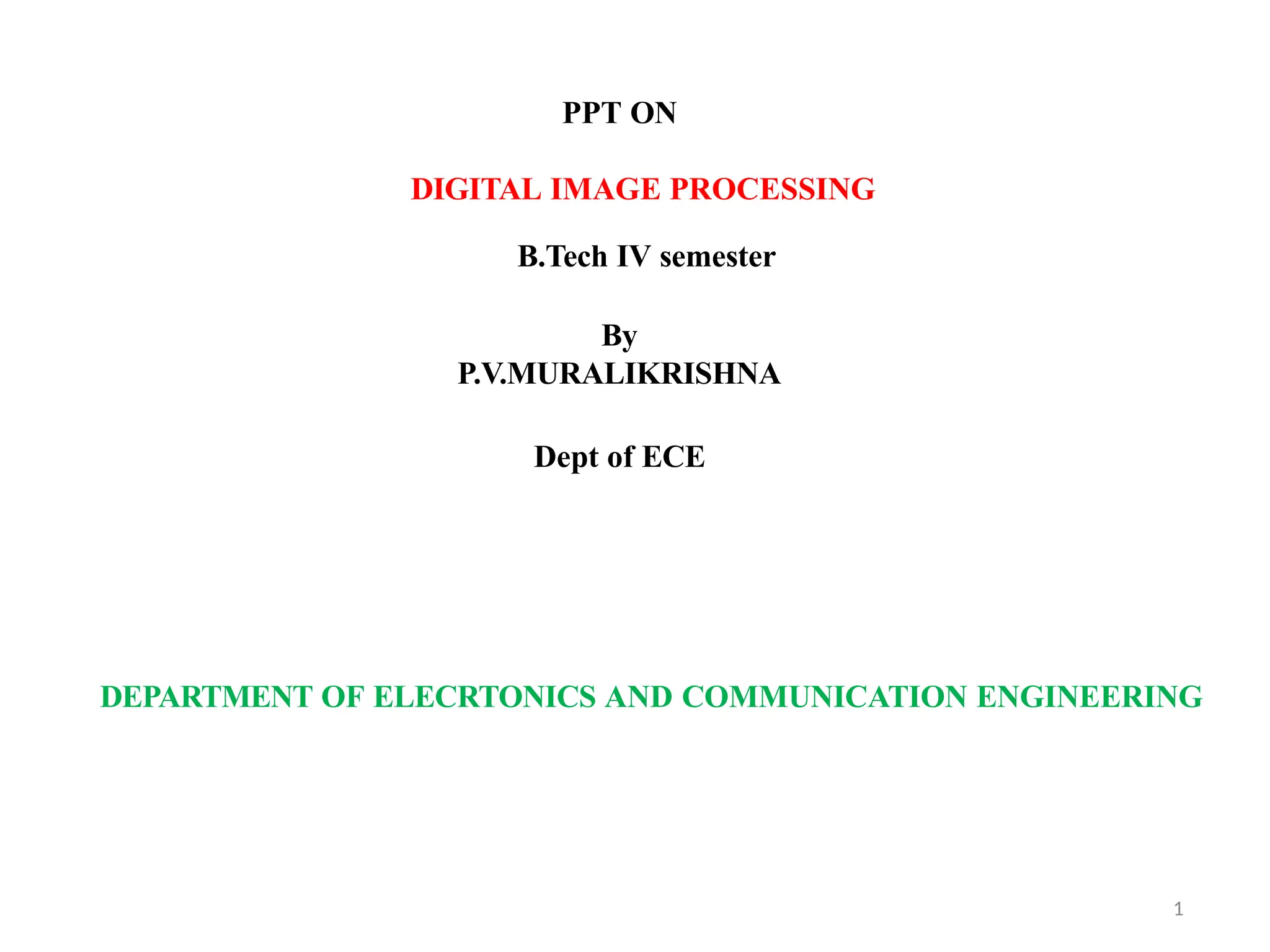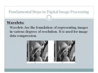 The document is a presentation on digital image processing for B.Tech students, detailing the fundamental concepts of digital images as two-dimensional functions with specific intensity values. It covers the definition of digital image processing, its historical origins, and the development of image quality in early systems. Notably, it explains the components of image formation and the significance of pixels as the primary elements of digital images.