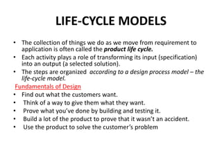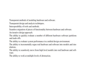 The document discusses various life-cycle models used in embedded systems design, including the waterfall, v cycle, spiral, and rapid prototyping models. It emphasizes the importance of addressing customer requirements, iterative development, and testing throughout the design process. Additionally, it highlights the co-design methodology that integrates hardware and software development for improved predictability and control over complex system designs.