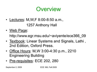 This document provides an introduction to the ECE 366 Signals and Systems course taught in fall 2009. It outlines the course details such as lectures, textbook, assignments, exams. It also covers an overview of key concepts in signals and systems including definitions of signals, systems, their properties and classifications. Examples of applications are also discussed.