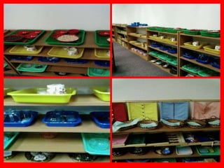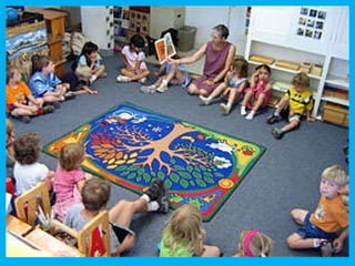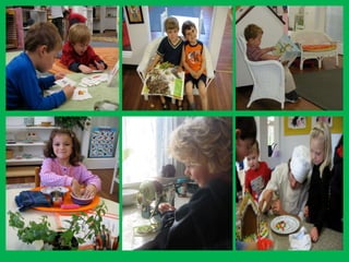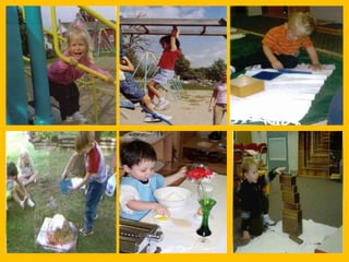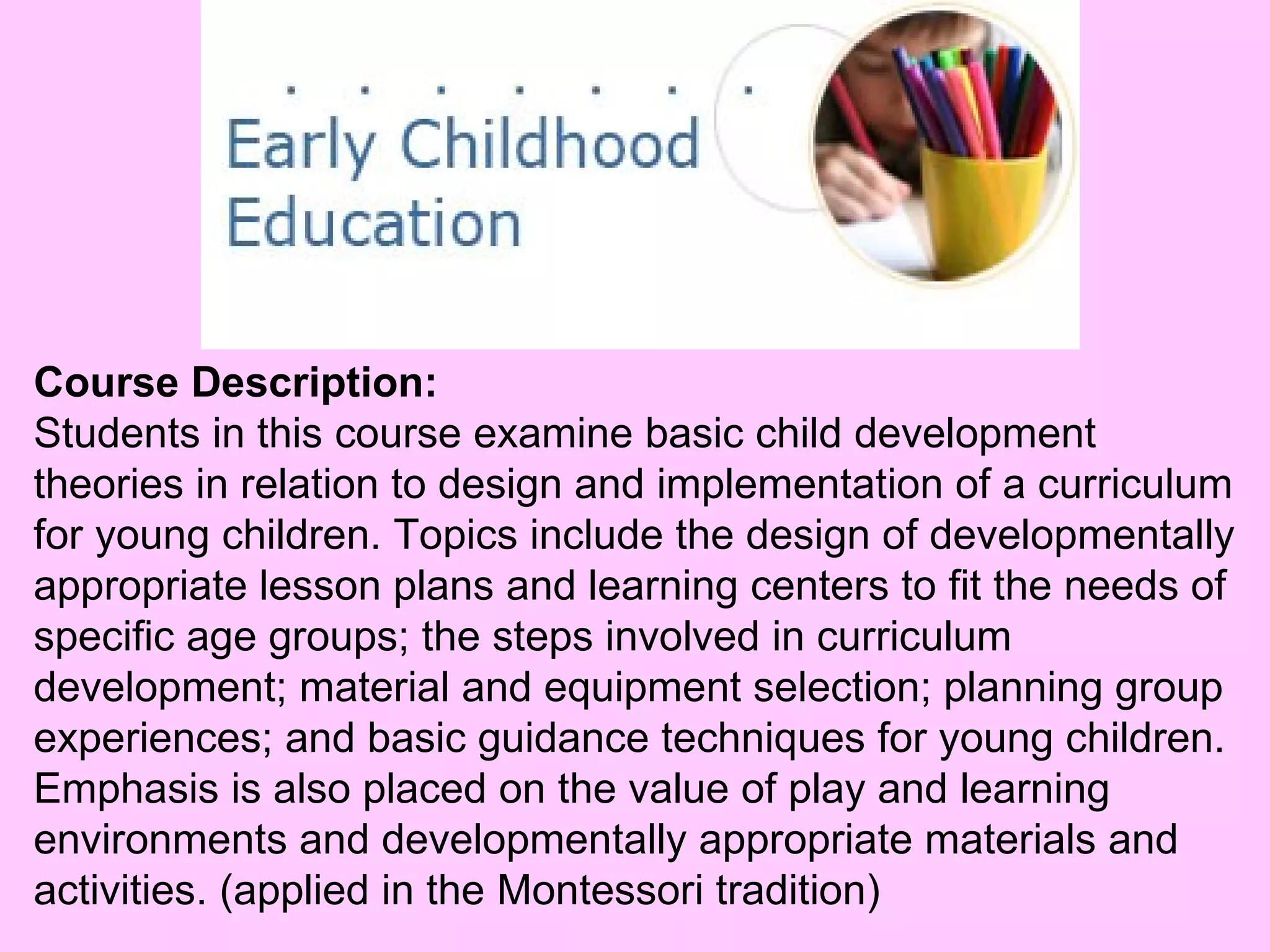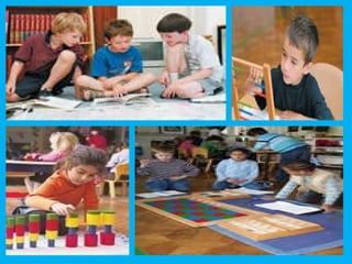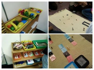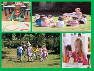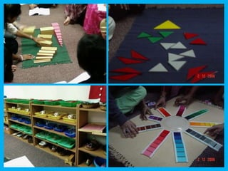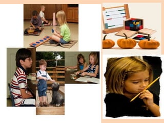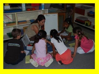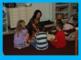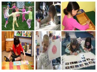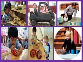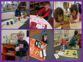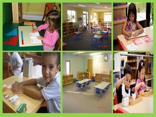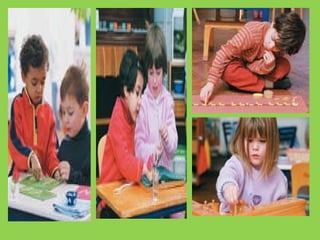 This document summarizes the key components of two early childhood curricula - the Montessori method and The Creative Curriculum. The Montessori method focuses on practical life skills, sensorial activities, language, mathematics, science, geography, music and art. The Creative Curriculum is a comprehensive system that includes curriculum, assessment, implementation and professional development to support child development and learning. It is based on scientific research in child development and learning theories.
