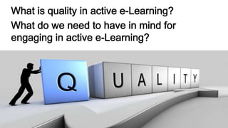 The document outlines a four-level framework for assessing quality practices in active e-learning, detailing key concepts like learner-centeredness, relevant technology use, and planned alignment in e-learning design. It emphasizes the importance of engagement, collaboration, and authentic learning experiences to enhance student involvement. The framework consists of various sub-dimensions and categories that aid in evaluating institutional and participant backgrounds, program design, and the learning process.