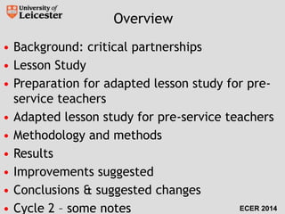 The document describes an adapted lesson study approach used with pre-service teachers in initial teacher education. Over three cycles, groups of pre-service teachers planned and taught lessons in local schools while observing each other and receiving feedback. Questionnaires and reflections showed this approach improved the pre-service teachers' confidence in areas like lesson planning, teaching, observing pupils, collaboration and reflection. Suggested improvements included reducing group sizes and roles to focus more on pupil learning and the teacher's role.