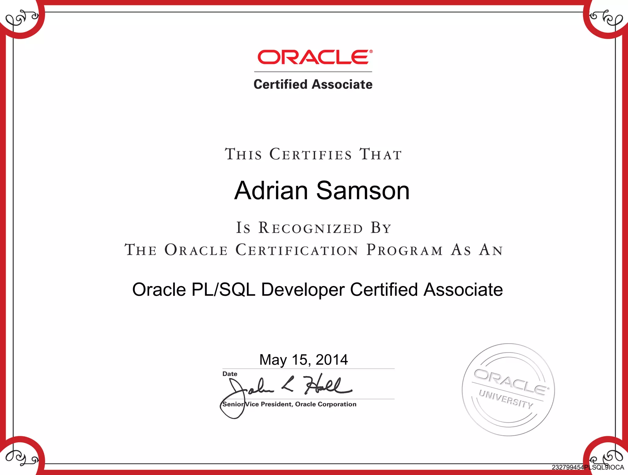 This document certifies that Adrian Samson has passed the Oracle PL/SQL Developer Certified Associate exam on May 15, 2014. The certification number is 232799454PLSQL9IOCA.