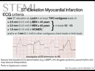 The ECG provides a window into the heart, lungs, electrolytes, body temperature and sometimes the brain. It is important to systematically interpret the ECG by examining features like the rate, rhythm, axes, QRS complex, ST segment, T waves and QTc interval. Interpreting ECGs helps identify conditions like myocardial ischemia, electrolyte imbalances and long QT syndrome. It is important to record the time and name on the ECG and order repeat ECGs as needed to monitor patients.