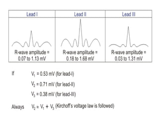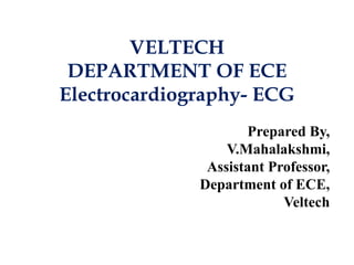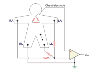 This document provides an overview of electrocardiography (ECG). It defines ECG as the study of the electrical activity of the heart muscles using an electrocardiograph. It describes the anatomy of the heart including its four chambers, four valves, three layers, blood vessels, and dual circulation systems. It also explains the different ECG lead systems including standard bipolar limb leads, augmented unipolar limb leads, and chest leads. Finally, it outlines the basic components of an ECG recording setup including defibrillator protection, lead selection logic, calibration, pre-amplification, power amplification, feedback, and output display.