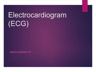 This document provides an overview of electrocardiograms (ECGs). It describes what an ECG is, how it works, the parts of an ECG waveform including the P, QRS, T, and U waves, intervals like the P-R and Q-T intervals, segments like the S-T segment, how to calculate heart rate from an ECG, the clinical significance of various ECG parameters, and common abnormalities that can be diagnosed using an ECG.