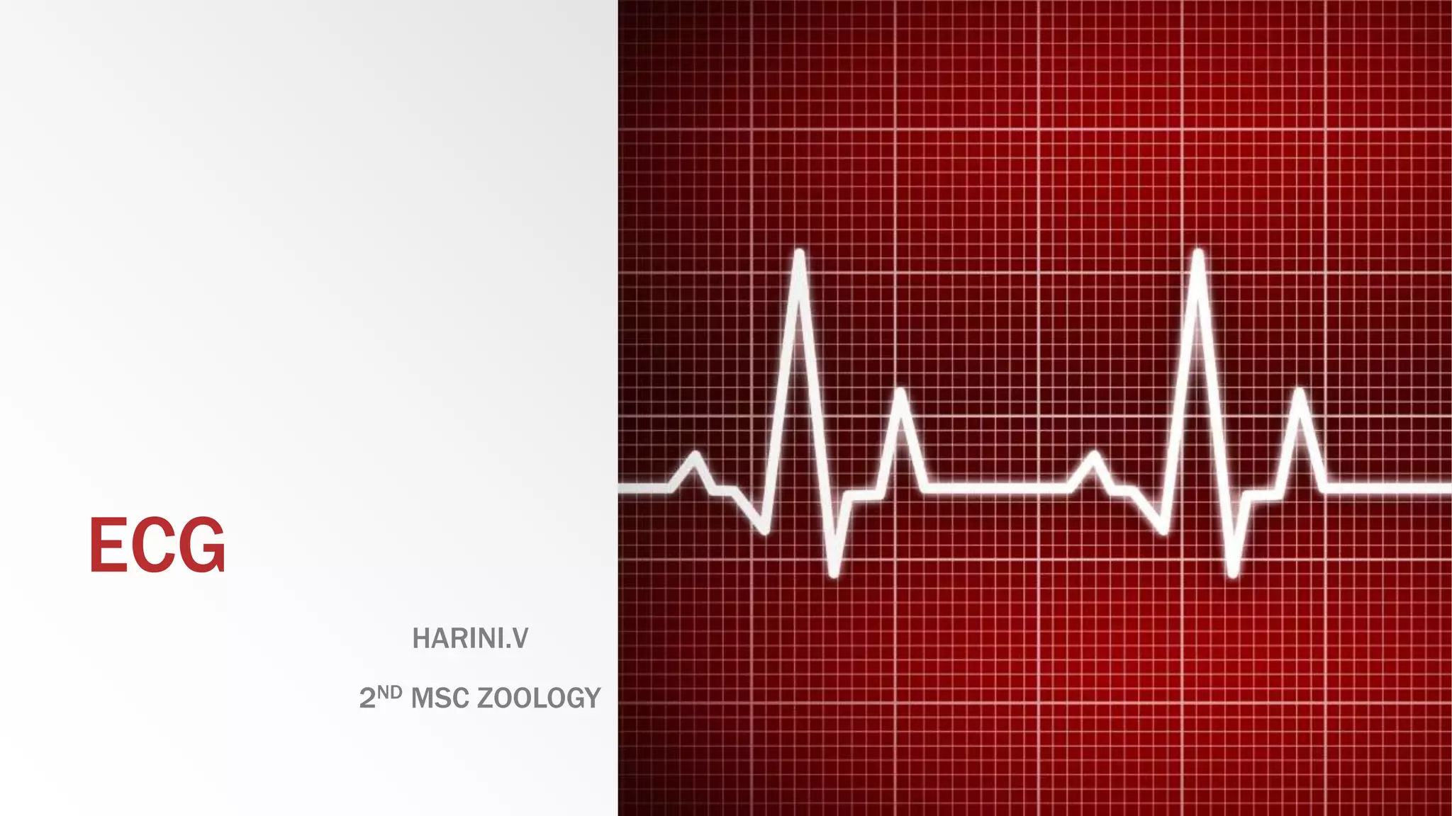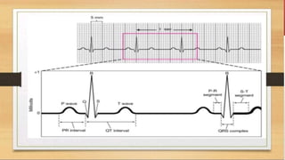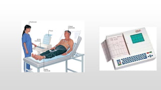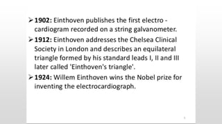 The document provides an overview of electrocardiograms (ECG), including their function in monitoring heart activity through electrical impulses. It outlines the historical development of ECG technology, significant scientists involved, and the interpretation of heart rhythm through defined waves (PQRST). Additionally, it discusses various clinical uses of ECG, including diagnosing heart conditions and the effects of medication.