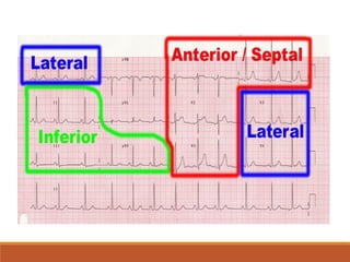 The document provides a comprehensive overview of ECG interpretation, detailing key components such as P-waves, QRS complexes, and intervals like PR and QT. It explains the normal ranges for these intervals and how deviations can indicate various cardiac conditions, including left and right axis deviations and arrhythmias such as atrial fibrillation and paroxysmal supraventricular tachycardia. Additionally, it outlines the anatomy of heart electrode placements and how to analyze ECG waveforms for diagnosing cardiac issues.