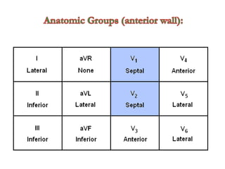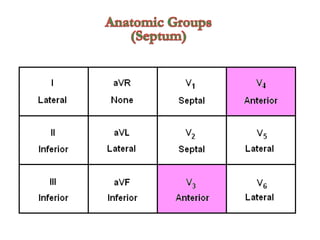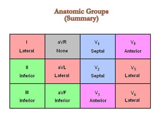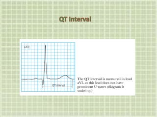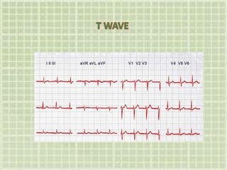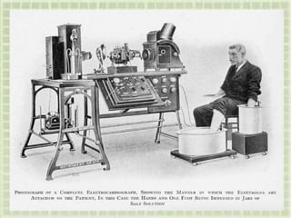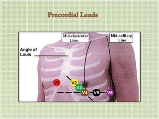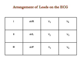 The document provides an overview of electrocardiography (ECG). It discusses the history of ECG development. It then covers how to perform an ECG, how an ECG works by detecting electrical changes during heartbeats, ECG paper calibration, the 12 leads, and how to interpret various ECG components like rate, rhythm, axes, waves, intervals, and segments. Key points about normal ECG readings are also presented along with 10 interpretation rules.