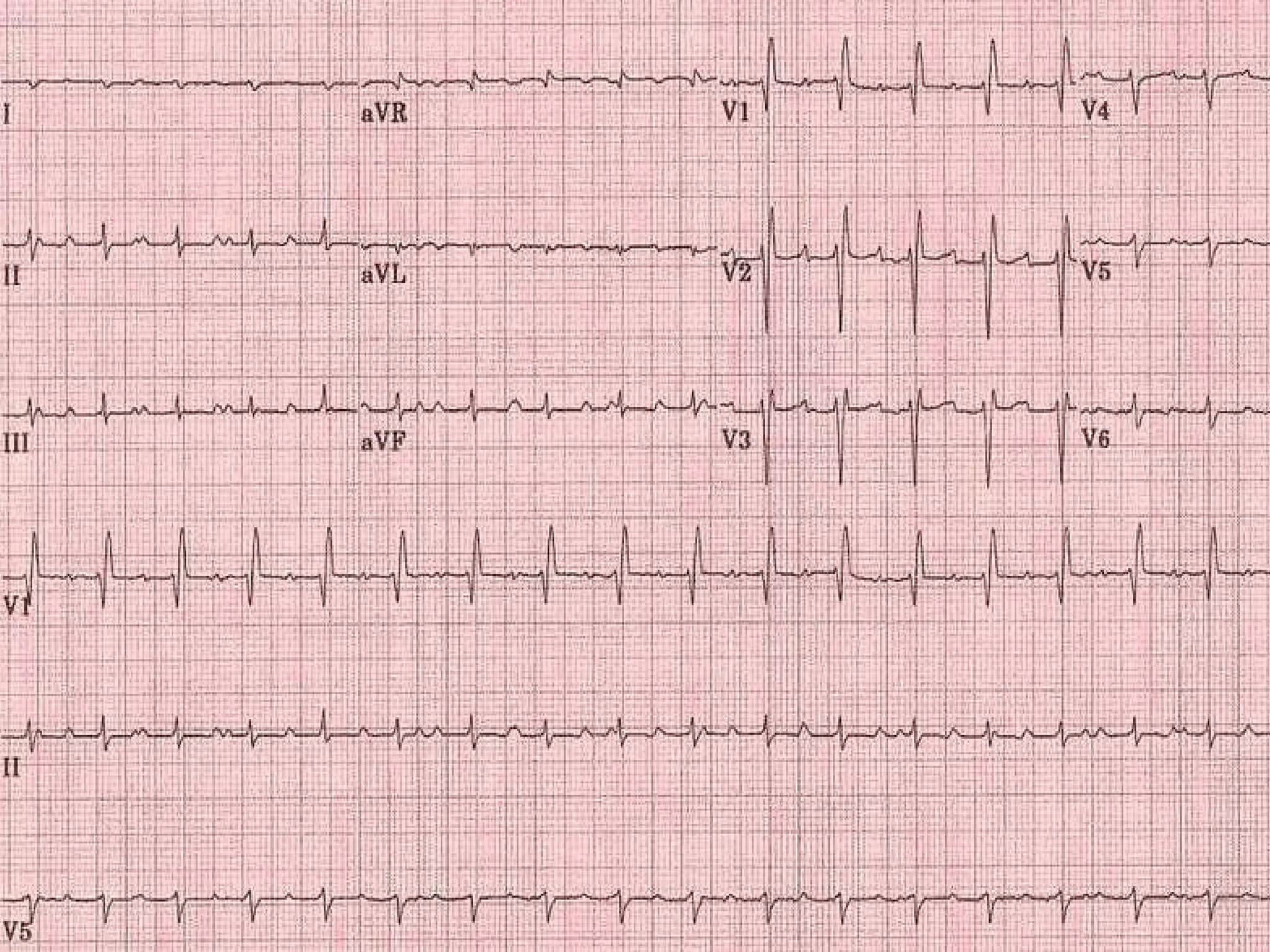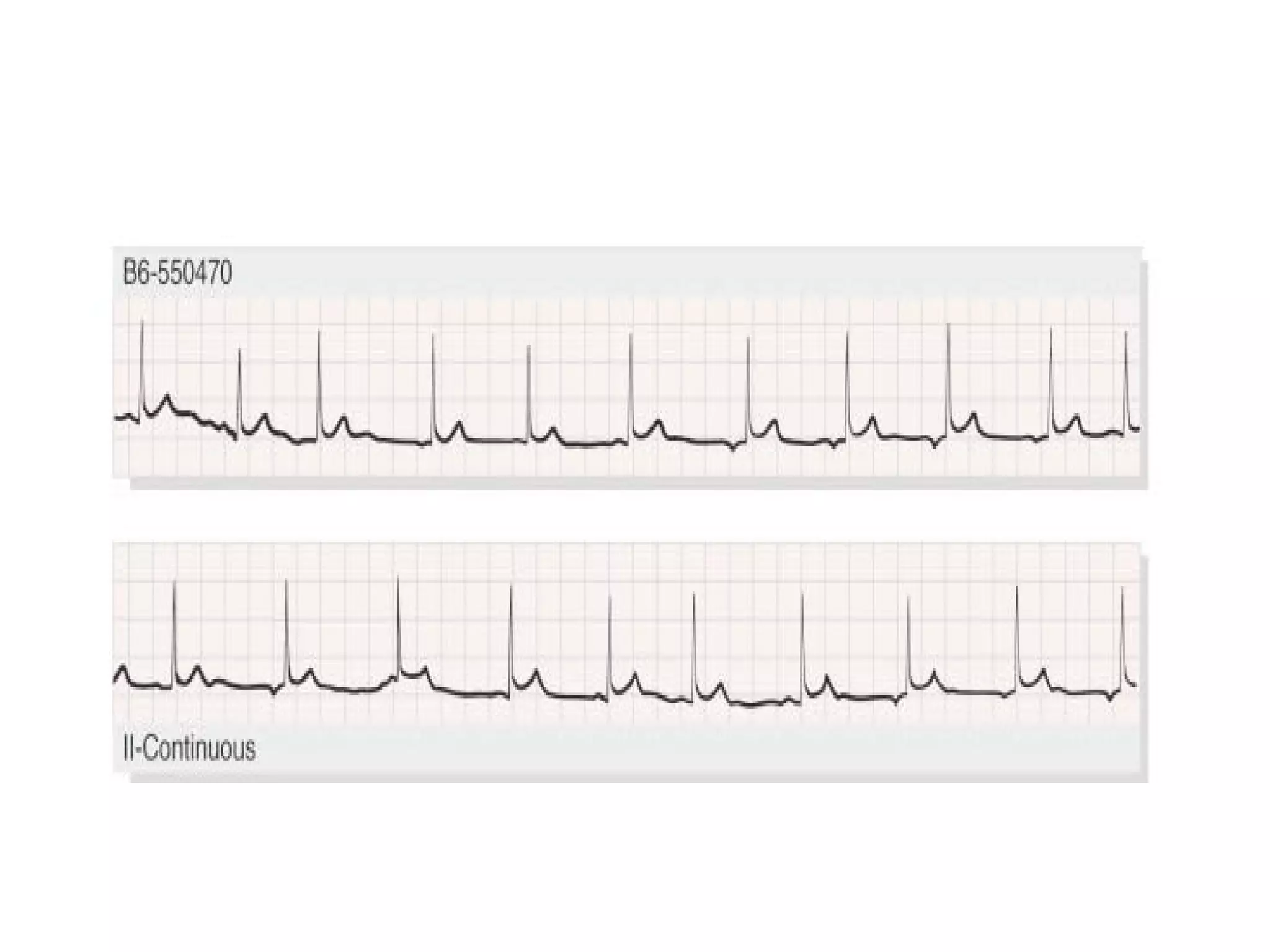 This ECG shows atrial dissociation in a 70-year-old male with a history of hypertension, coronary artery disease, and cardiac transplantation 6 months prior. Atrial dissociation is seen as two independent sets of P waves with varying PP and PR intervals. Atrial dissociation occurs when each atrium beats separately due to blockage of the Bachmann's bundle interatrial pathway. It can occur in orthotopic and heterotopic heart transplant patients as the posterior atrial wall is retained but denervated after orthotopic transplant.