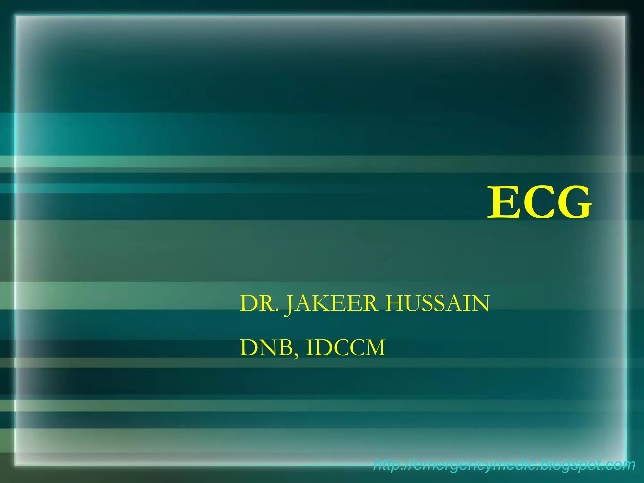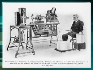 This document provides an overview of electrocardiography (ECG/EKG) including its history, components, and how to interpret common rhythms. Some key points:
