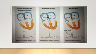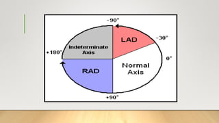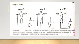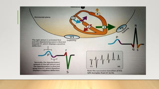 The document provides a comprehensive overview of electrocardiograms (ECGs), explaining their definition, history, types of leads, and interpretation techniques. Key topics include the sequence of electrical activation in the heart, heart rate determination methods, and various abnormalities that can be identified through ECG analysis. Additionally, it details the factors affecting ECG results, such as axis determination and common causes of changes in wave morphology.