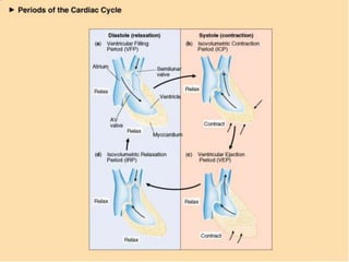 The document discusses the electrocardiogram (ECG or EKG), which records the electrical activity of the heart. It describes the cardiac cycle, including the electrical and mechanical events that occur with each heartbeat. Specifically, it discusses the phases of atrial systole and ventricular systole, as well as the mechanical events of ventricular filling, isovolumetric contraction, ventricular ejection, and isovolumetric relaxation. It also explains how electrical changes in heart tissue cause mechanical changes like muscle contraction.