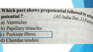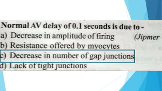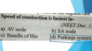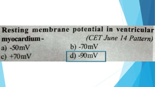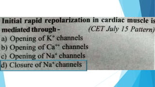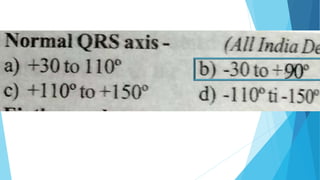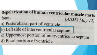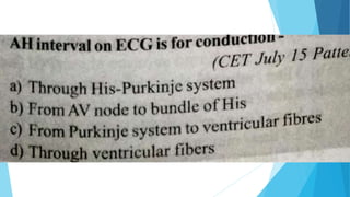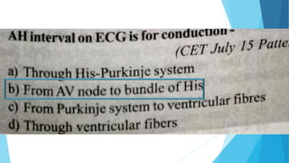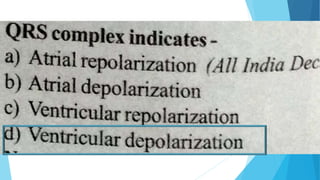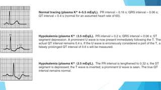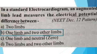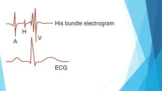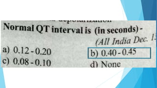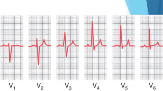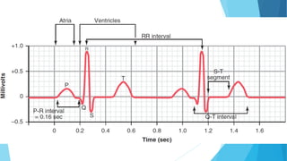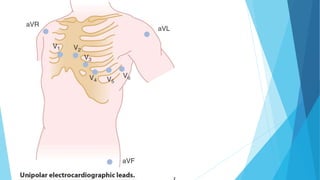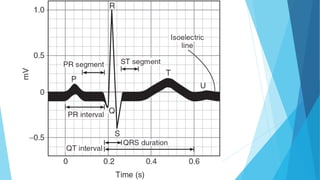 This document discusses the electrocardiogram (ECG) and its components. It begins by describing the myocardial action potential and its phases. It then discusses the pacemaker action potential and ECG waves including the P, QRS, T, and U waves. It explains ECG intervals such as the PR, QT, and ST segments. The document also covers ECG leads, normal values, procedures for recording an ECG, interpreting ECG findings, and clinical applications of the ECG.