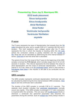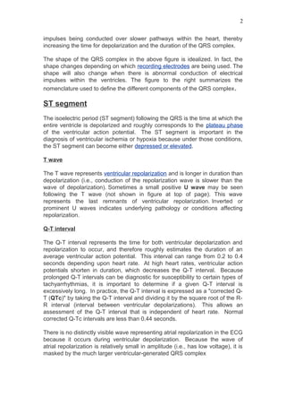 - The components of the ECG waveform and what each represents, such as the P wave for atrial depolarization and QRS complex for ventricular depolarization.