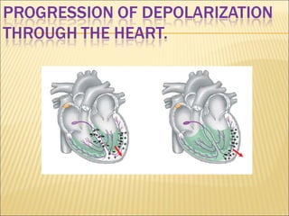 2) How an ECG works by showing the electrical activity of a single cell depolarizing and propagating in a wave through the heart until repolarization restores the cells.