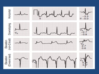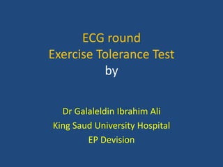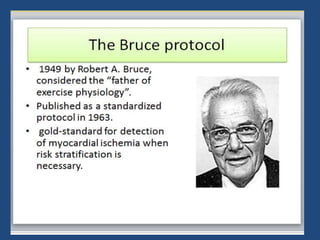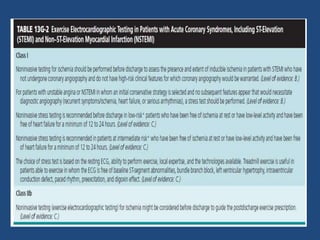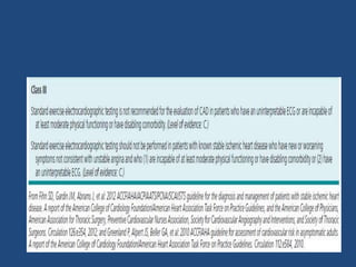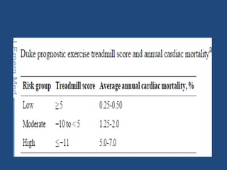 The document outlines an exercise tolerance test for diagnosing coronary artery disease (CAD) and assessing patient prognosis and functional capacity, covering physiological aspects, contraindications, and technical considerations of testing. It details the physiological responses to exercise, optimal protocols, monitoring during tests, and the interpretation of various metrics, including heart rate and blood pressure changes. Furthermore, it discusses diagnostic and prognostic values of the exercise electrocardiogram and provides guidelines for interpreting test results.