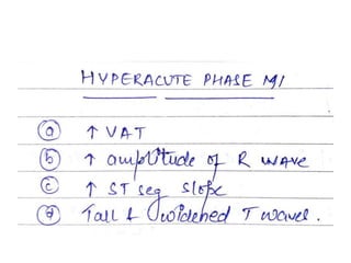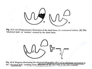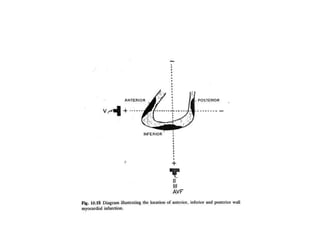 This document discusses ECG patterns in myocardial infarction. It covers QRS changes, myocardial ischemia, and reciprocal and indicative changes seen on ECG that can help localize the site of myocardial infarction, such as changes seen in posterior wall MIs or right ventricular MIs.