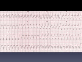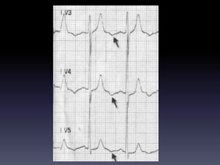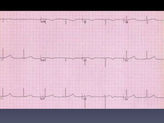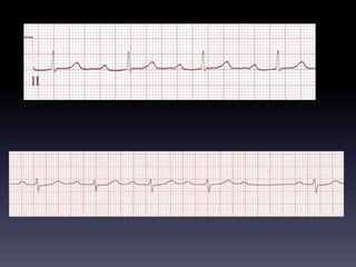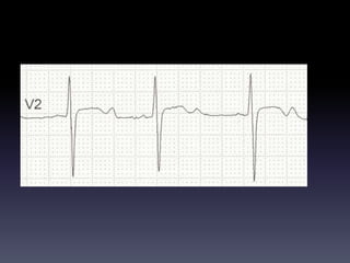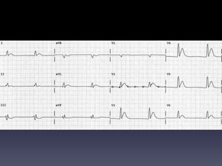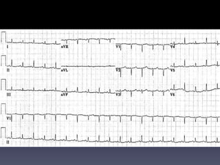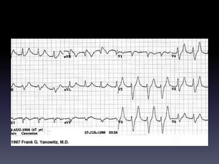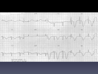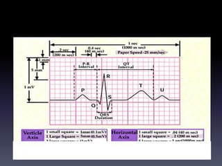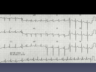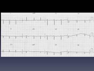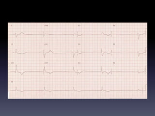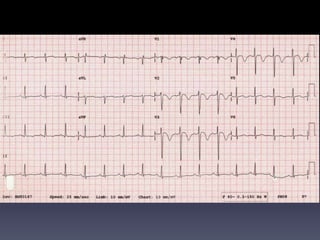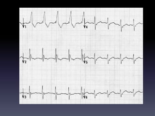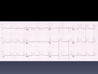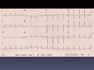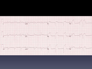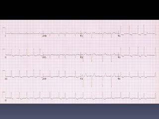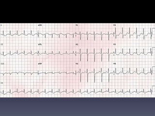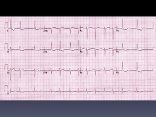 This document provides an overview of electrocardiogram (ECG) interpretation. It discusses the components of a normal ECG tracing including rate, rhythm, axis, waveforms such as P, QRS, ST segments, and T waves. It describes how to systematically evaluate an ECG and identify abnormalities. Common abnormalities are outlined such as arrhythmias, conduction blocks, myocardial infarction, hypertrophy, and electrolyte disturbances. Causes of abnormalities in various ECG components are also reviewed. The goal is to provide clinicians a methodical approach to ECG interpretation.