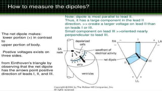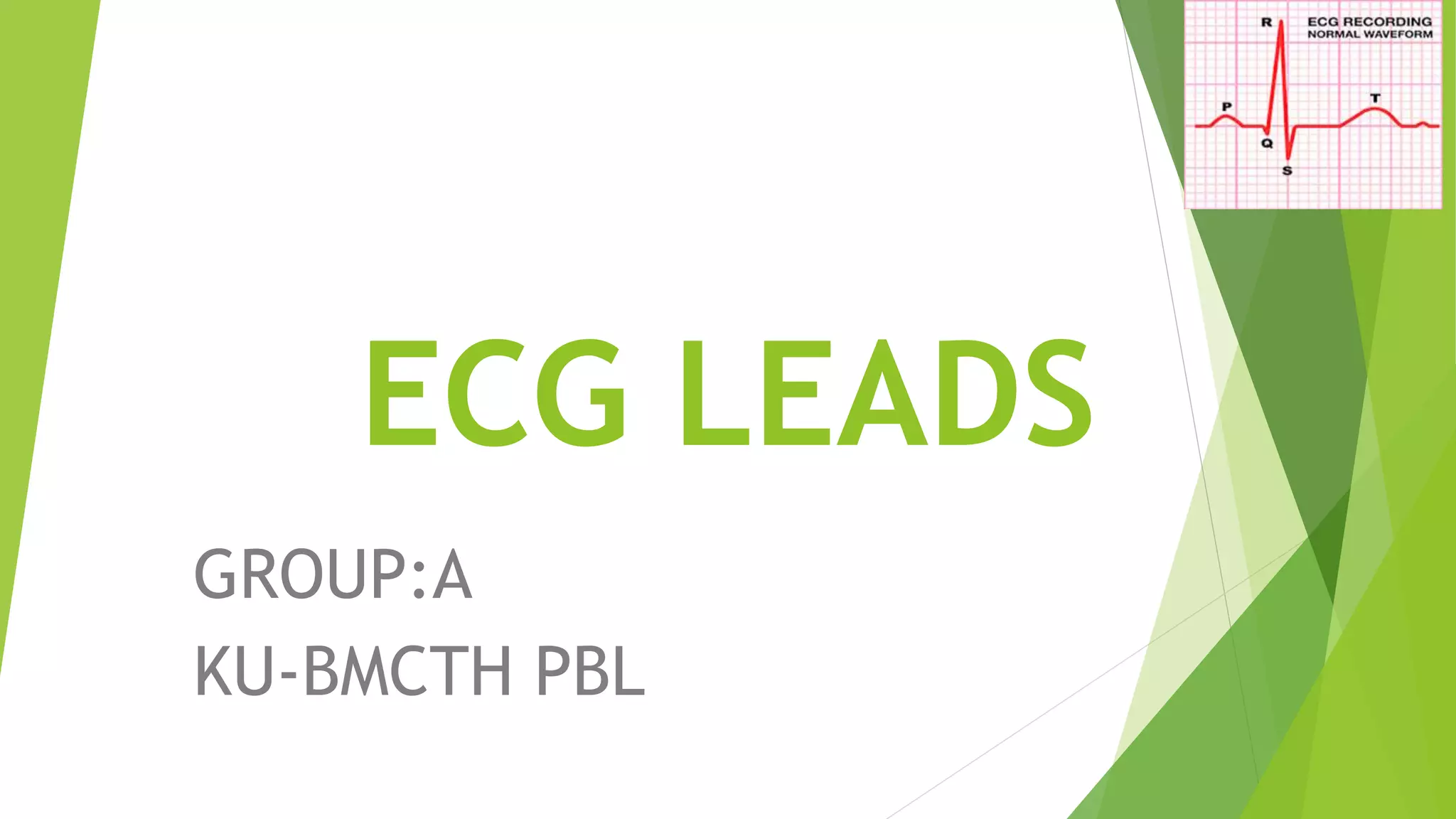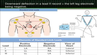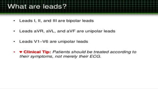 The document provides an introduction to ECG (electrocardiogram), detailing its function in recording the heart's electrical activity and diagnosing irregularities. It explains the types of leads used in ECG, including unipolar and bipolar leads, and outlines the configuration of bipolar limb leads and the Einthoven law. Additionally, it mentions augmented leads and their graphical representation.