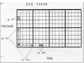 The document discusses electrocardiography (ECG), which is the procedure used to record the electrical activity of the heart. An ECG machine records potential differences between two sites on the body produced by the heart's electrical activity. The ECG provides a characteristic waveform due to the spread of depolarization and repolarization with each heartbeat. Key aspects of the ECG include the P, Q, R, S, and T waves which correspond to atrial and ventricular depolarization and repolarization, and intervals like the P-R and Q-T that measure timing of these processes. The ECG remains one of the most commonly used cardiovascular diagnostic procedures over 100 years after its introduction.