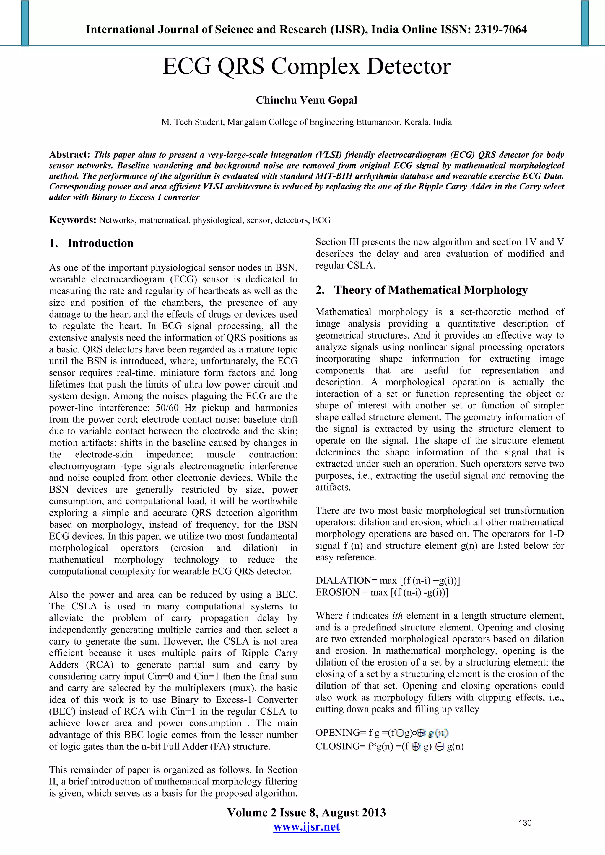 Este documento presenta un detector de QRS de electrocardiograma (ECG) basado en una tecnología de morfología matemática, diseñado para redes de sensores corporales. El algoritmo propuesto elimina el ruido y la deriva de la línea de base del ECG mediante operadores morfológicos, y se evalúa usando la base de datos MIT-BIH de arritmias, logrando una sensibilidad y predicción positiva del 100%. Además, se compara la eficiencia de área y potencia entre un sistema existente y uno modificado, encontrando que el sistema modificado es más eficiente en términos de consumo de área y energía.
