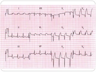 This document provides a 7-step approach to interpreting electrocardiograms (ECGs). The steps include: 1) assessing heart rate, 2) determining heart rhythm, 3) identifying the electrical heart axis, 4) measuring the PR interval, 5) analyzing the QRS complex, 6) examining repolarization in the ST-T segment, and 7) evaluating the R/S ratio. Common arrhythmias and abnormalities are described under each step along with their characteristic ECG patterns and management approaches. Assessment techniques using a caliper, pen and paper are recommended to accurately measure intervals and analyze rhythms and complexes.