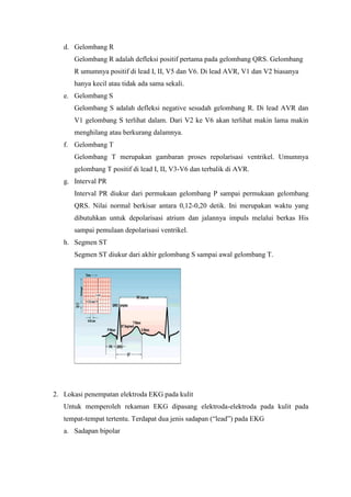 Dokumen tersebut membahas tentang elektrokardiograf (EKG) yang digunakan untuk memperoleh informasi kerja jantung dengan mengukur potensial listriknya sebagai fungsi waktu. Dokumen ini menjelaskan cara membaca hasil EKG, komponen gelombangnya, letak elektroda, dan contoh kesalahan saat perekaman EKG seperti pasien bergerak, elektroda kotor, atau kurangnya penggunaan gel pada elektroda.