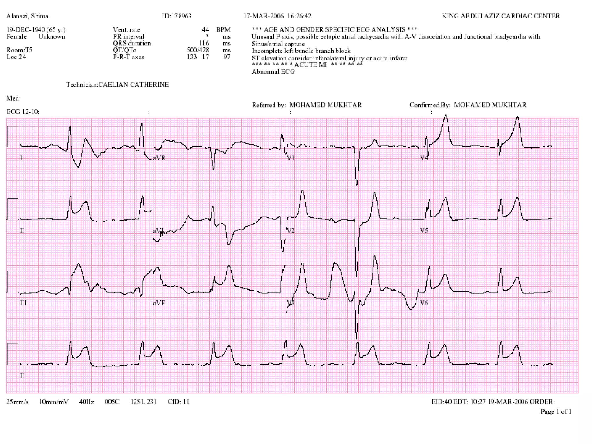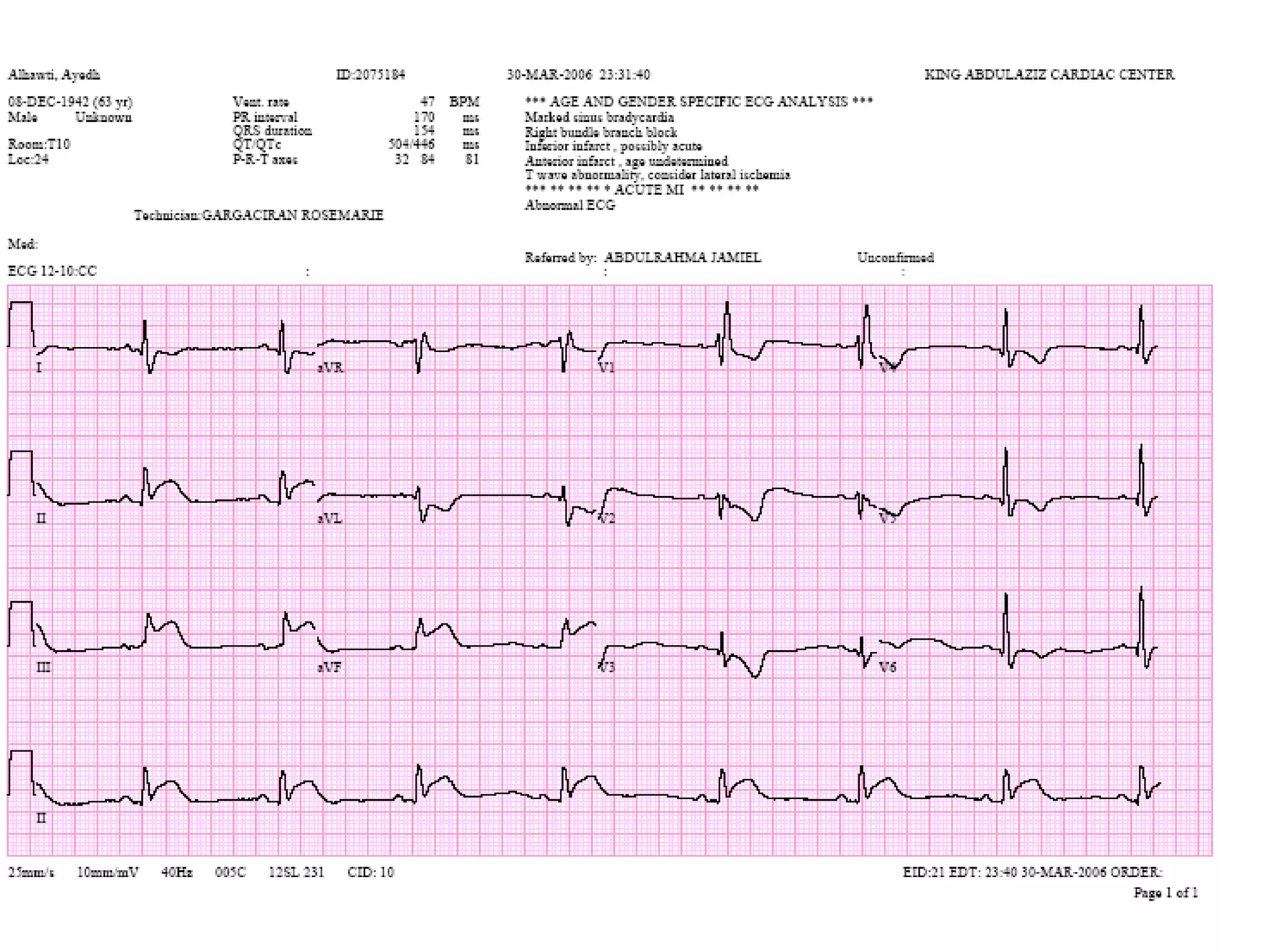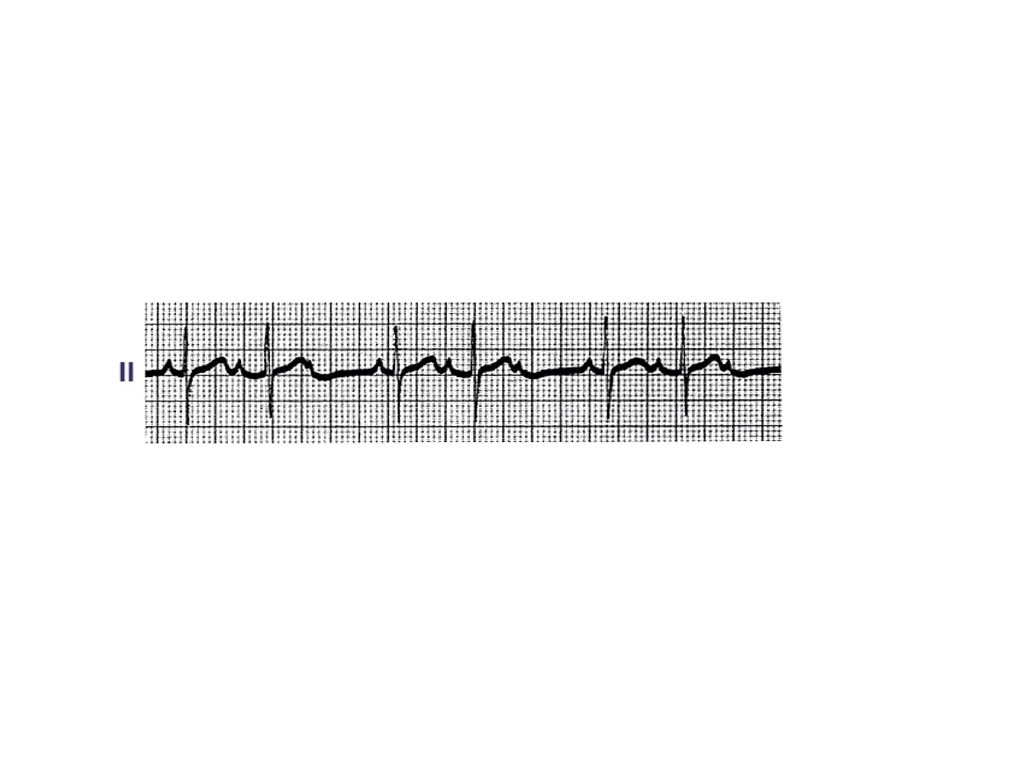 A 23-year-old female presented with episodes of feeling lightheaded and weak. She had a history of anorexia nervosa and had lost significant weight recently. Laboratory tests revealed low calcium, potassium, and other electrolyte abnormalities. During her emergency department stay, she experienced another episode where a rhythm strip was obtained. The rhythm strip showed a prolonged QT interval, likely the cause of her symptoms due to electrolyte abnormalities from her eating disorder.